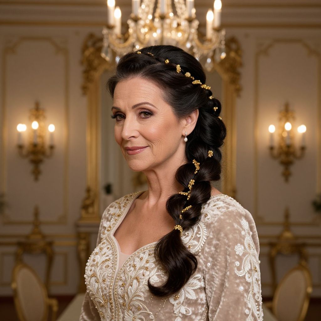 A serene mature bride with soft wrinkles around her eyes and a gentle smile, her hairstyle is a glamorous, elegant fishtail braid with gold accents, wearing a luxurious velvet wedding costume with embroidered details, posed in an old-style mansion ballroom with candlelight and crystal chandeliers.