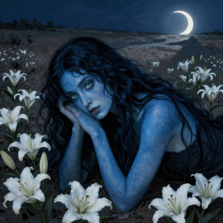 Photograph-style digital art of a pale-skinned woman with black hair and yellow eyes, lying in flowers, wearing a pink jacket, against a city