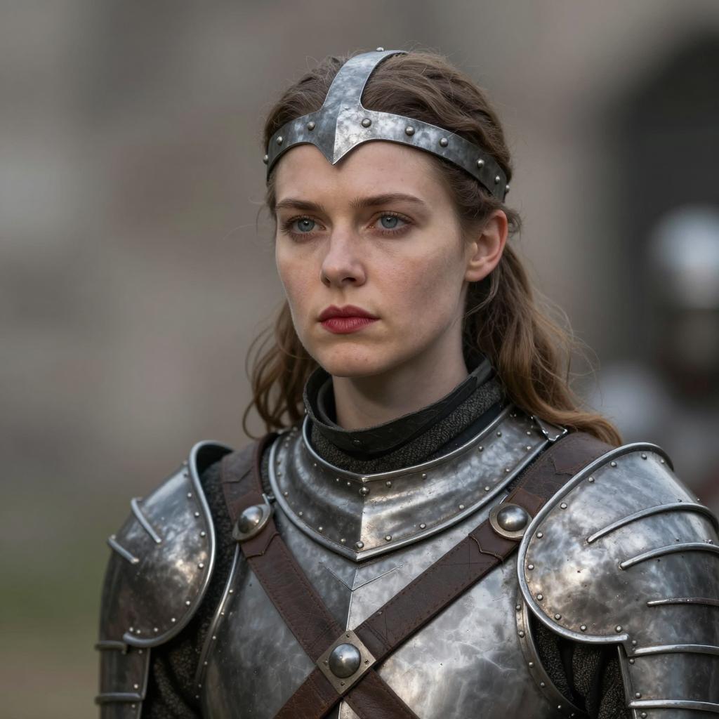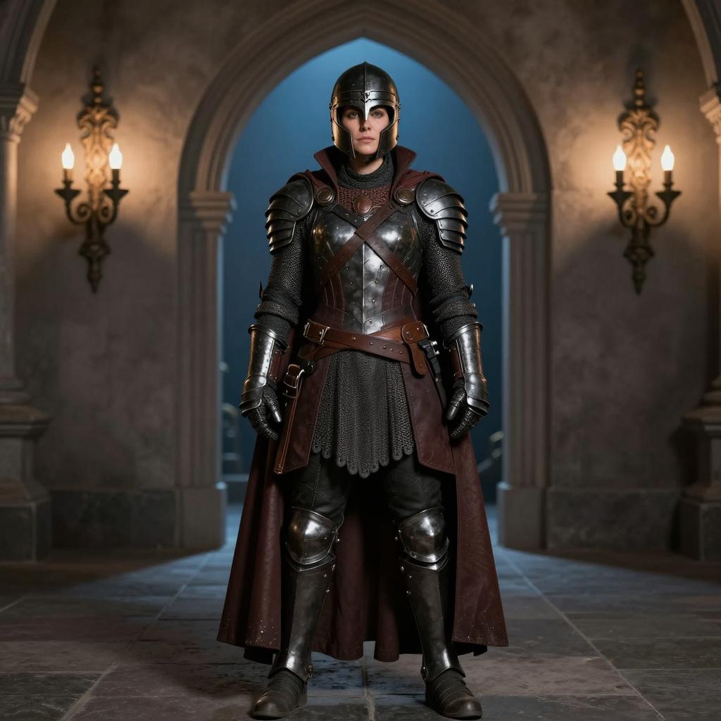 Yelena belova hawkeye, photograph of a woman in detailed fantasy armor, standing in a bright, elegant room, realistic style, full body, armor has black and brown leather with intricate metal plates, red cape with a velvet ure, quiver with arrows on her back, blonde hair in a side braid, neutral expression, beige walls with tall windows in the background, soft natural light, classic interior, medieval-inspired outfit, symmetrical composition, centered subject, high detail, movie still, character design