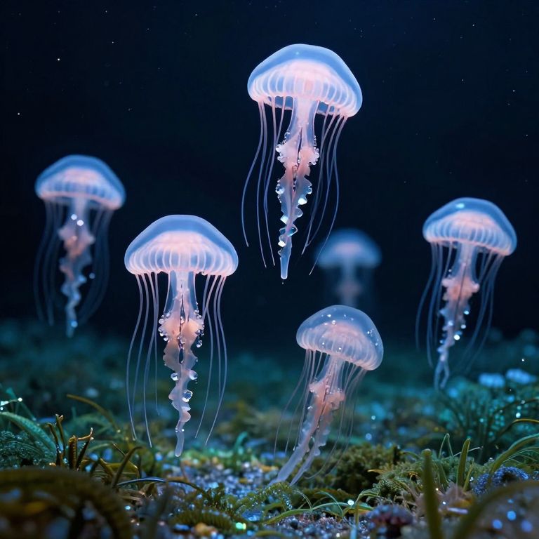 Photograph of glowing, translucent jellyfish with delicate, flowing tentacles floating above a dark, underwater seabed adorned with green algae and small sparkling particles