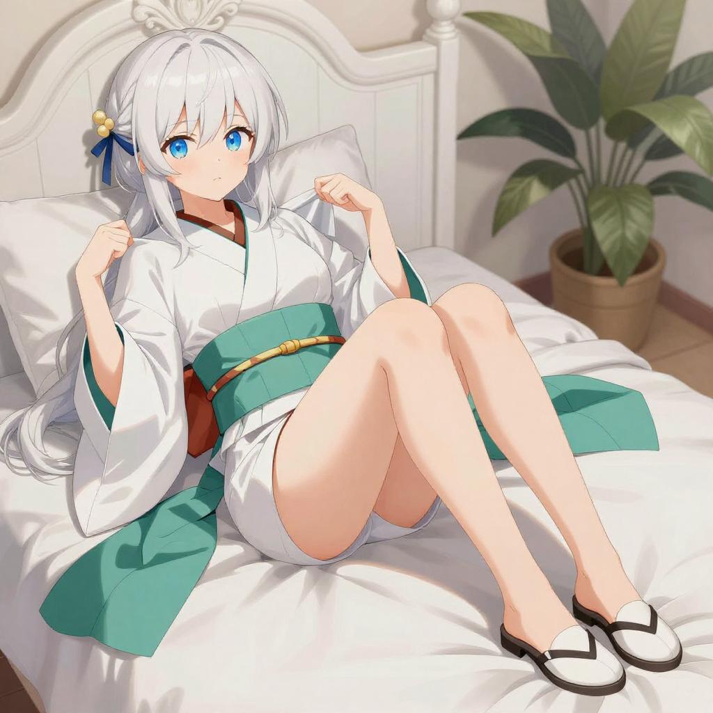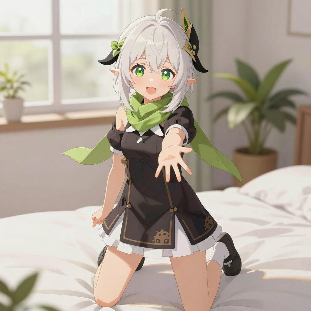 Digital anime-style drawing of a young girl with white hair and black hair accessory, wearing a black and white dress with a green scarf. She kneels on a white bed, reaching forward with an inviting expression. Background includes a blurred, sunlit window and green plants.