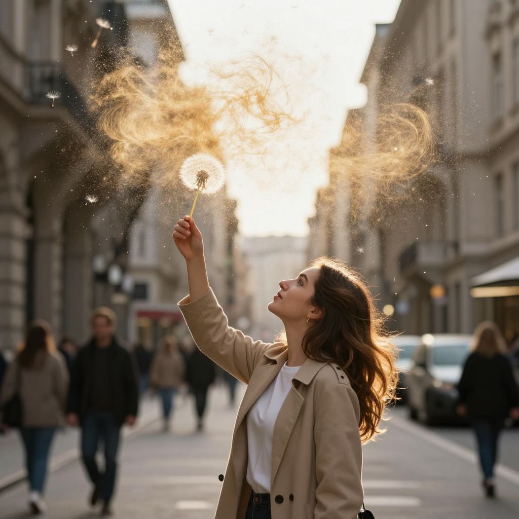 A woman in a bustling city street holds a dandelion whose seeds burst forth in a radiant, golden explosion, defying gravity as they swirl and shimmer like a living, ethereal cloud.