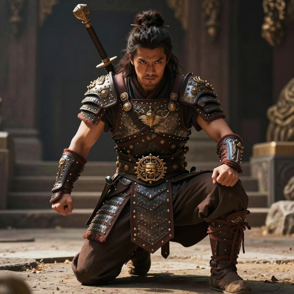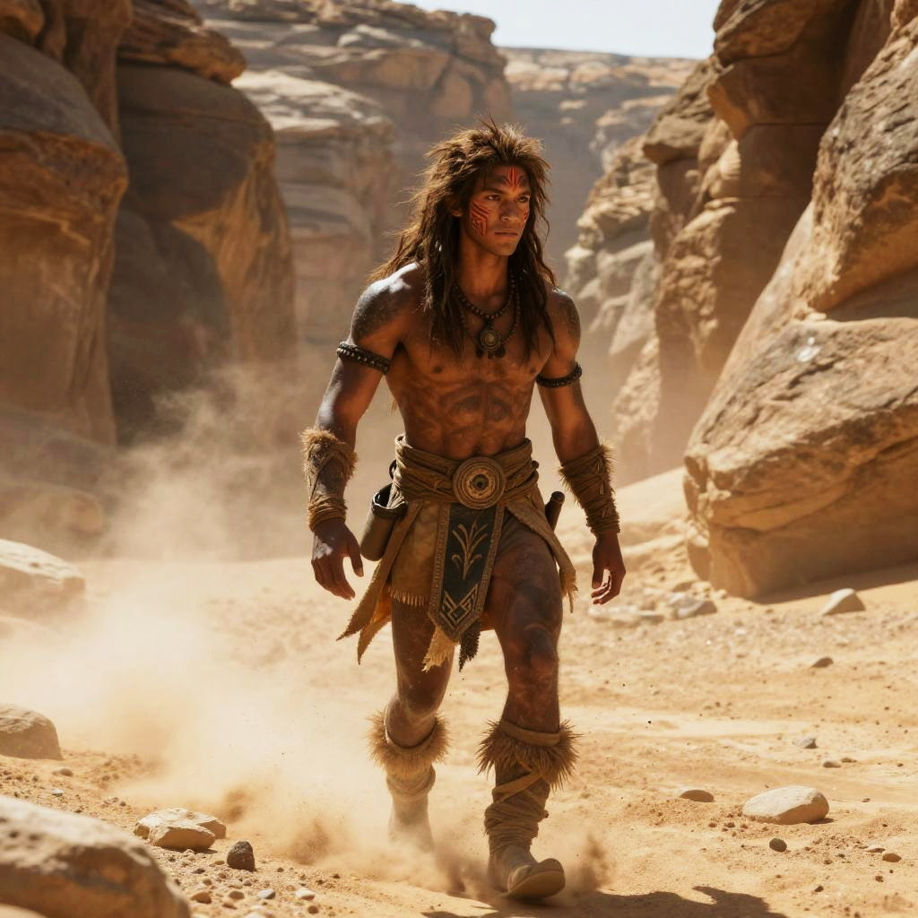 Heroic depiction of a ancient shaman launching a grappling hook toward a sacred stone altar ledge, surrounded by glowing mystical aura.