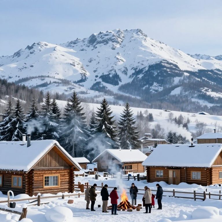Photograph of a snowy mountain village with log cabins, people standing around a campfire, steam rising, snow-covered evergreen trees, and rugged,