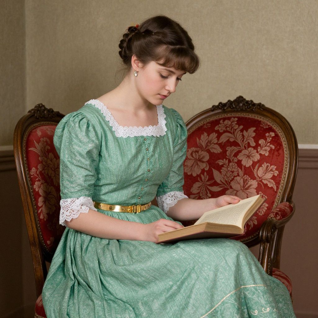 Photograph of a young Caucasian woman with fair skin and brown hair styled in an updo, seated on an ornate red and gold upholstered chair. She wears a vintage-style, light green dress with white lace sleeves and collar, accented by a gold belt. She is focused on reading an open book, held in both hands. The background features a beige wall with wooden wainscoting. The setting exudes a nostalgic, Victorian-era ambiance. The texture of the dress is soft and patterned, contrasting with the intricate design of the chair. The lighting is natural, highlighting her serene expression.