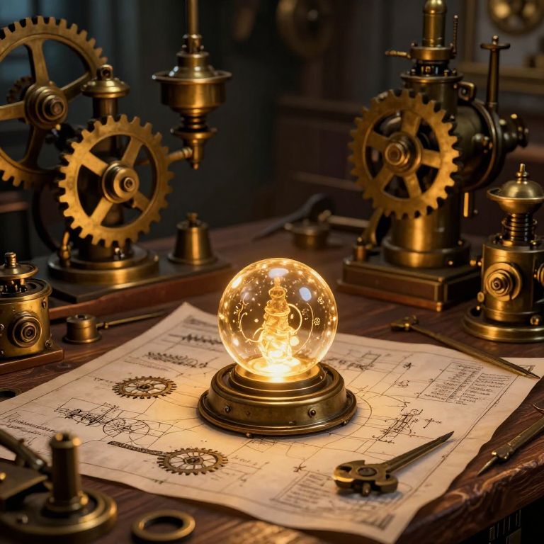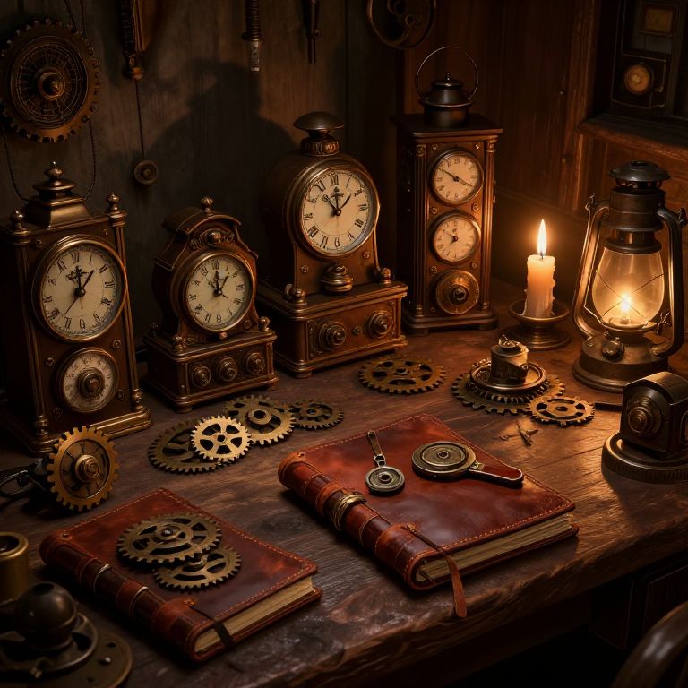 Eues set in a steampunk workshop filled with brass gears and steam pipes, a glowing artifact resting on a wooden table surrounded by ancient blueprints and mechanical tools, warm lighting, atmospheric depth, intricate craftsmanship