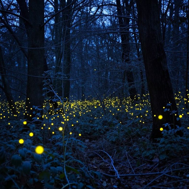 A forest of frozen fireflies glows ominously beneath an eternal twilight, casting cold light that warms only those who tell lies.