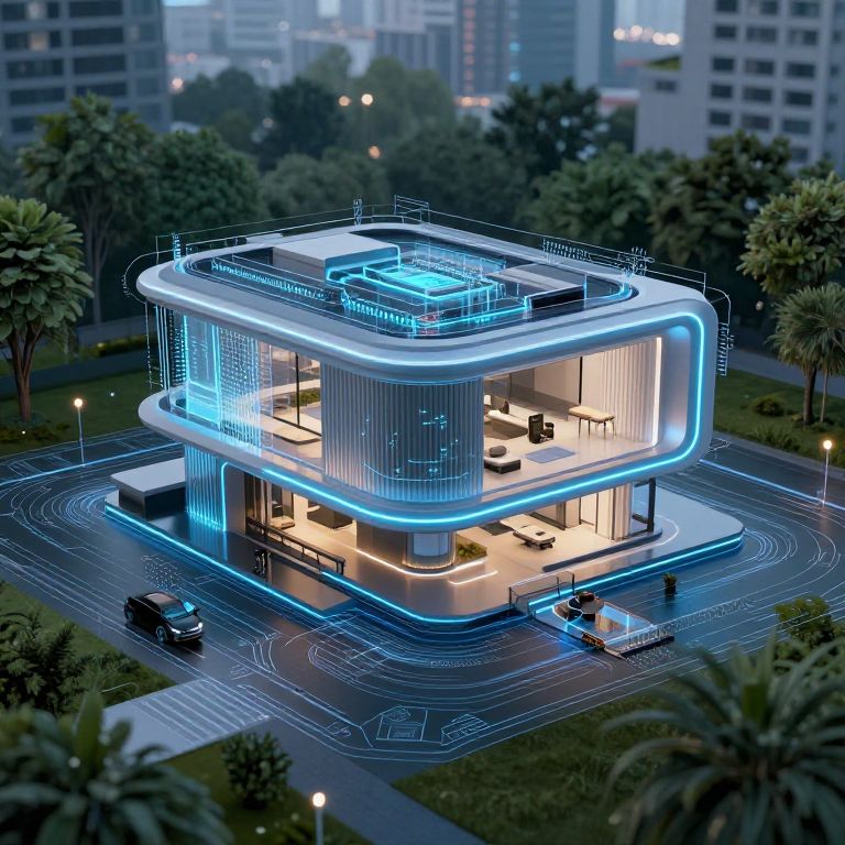 AI to design house concept, futuristic architectural blueprint glowing with digital neon accents, smart home integrated technology, sleek minimalist structure in a lush urban environment, hyper-realistic rendering with advanced AI creativity, photorealistic detail