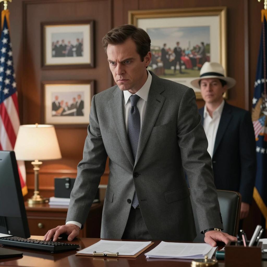 Man with pale skin, slicked-back brown hair, wearing a red pinstripe suit, striped shirt, and plaid tie, leans forward with hands on a table. Rings on both hands. Background has dark green and red horizontal stripes. Partially visible blue-clad person on the right.