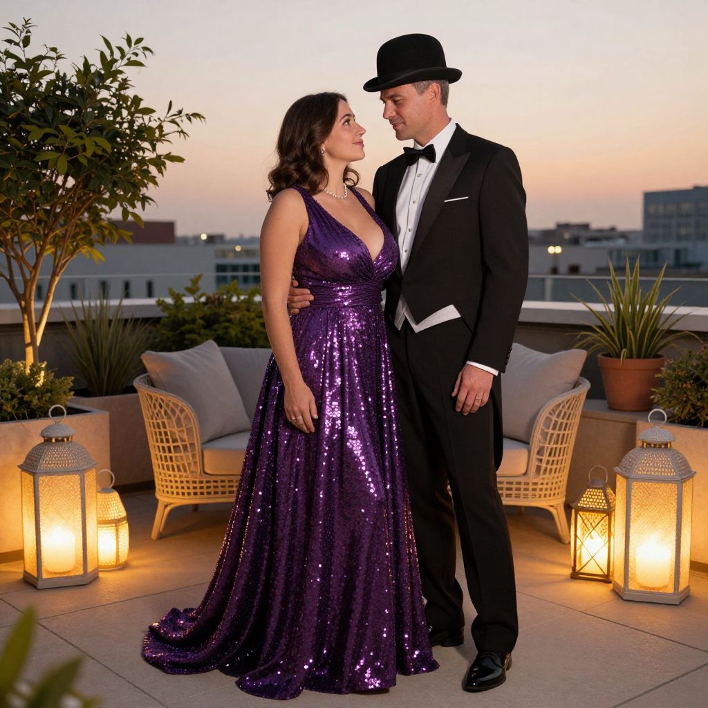 A romantic, high-resolution photo of a couple in matching date night outfit costumes — a woman in a flowing purple sequin gown and a man in a tuxedo with a bowler hat, standing at a quiet rooftop garden at dusk, surrounded by soft golden lighting and glowing lanterns.. The woman has big tits and cute face