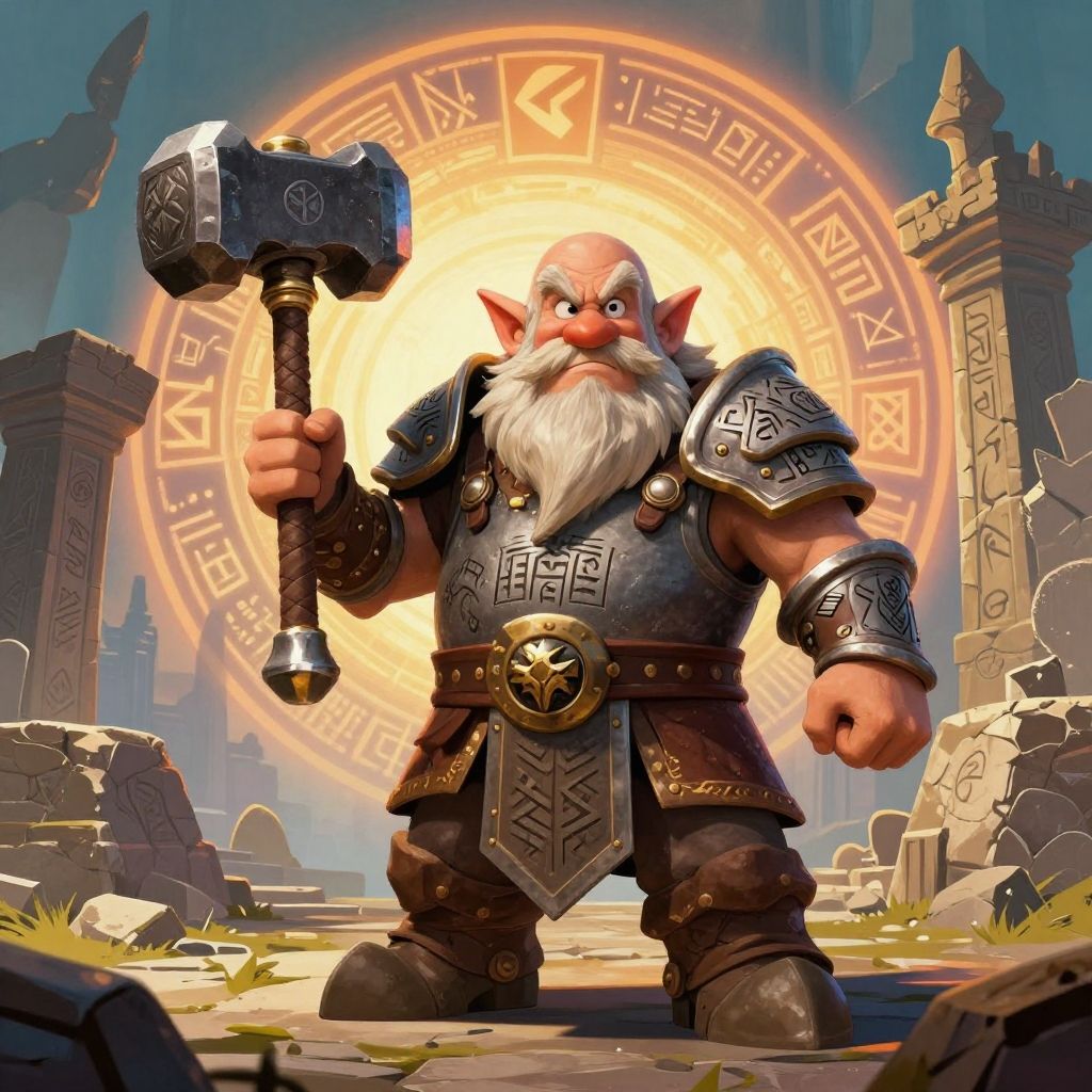 A stout dwarf warrior clad in heavy, intricately engraved armor stands firm holding a massive hammer. The background features ancient ruins and a glowing mystical runic circle, creating a vivid fantasy epic scene. The dwarf has a long white beard, pointed ears, and an intense expression, symbolizing strength and resilience.