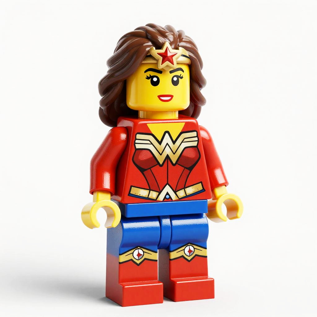 Diana Prince LEGO figure from Wonder Woman. Rendered in mini figure LEGO style with a classic vintage look.