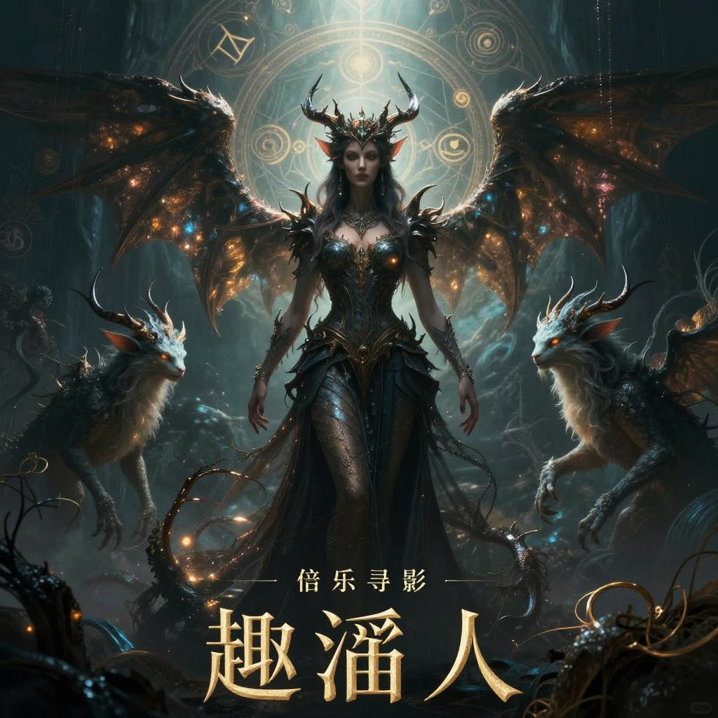 Digital fantasy artwork of a dark, horned, winged queen with glowing eyes, surrounded by ethereal, dragon-like creatures, set against a cosmic