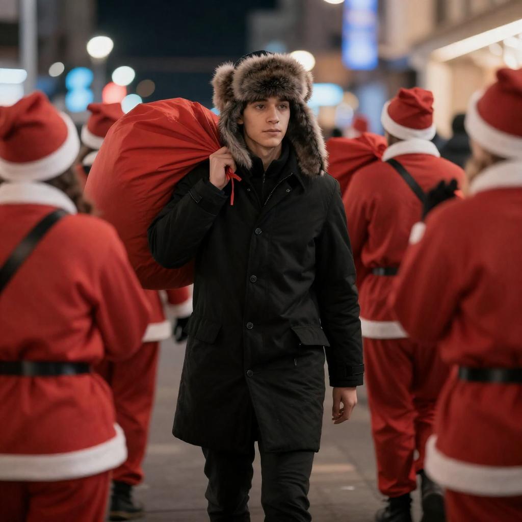 Young man in black coat and fur hat surrounded by multiple people in red Santa outfits with white fur trim, carrying large red sacks. Nighttime street scene with colorful lights in background. Man's expression is neutral, others' backs visible.