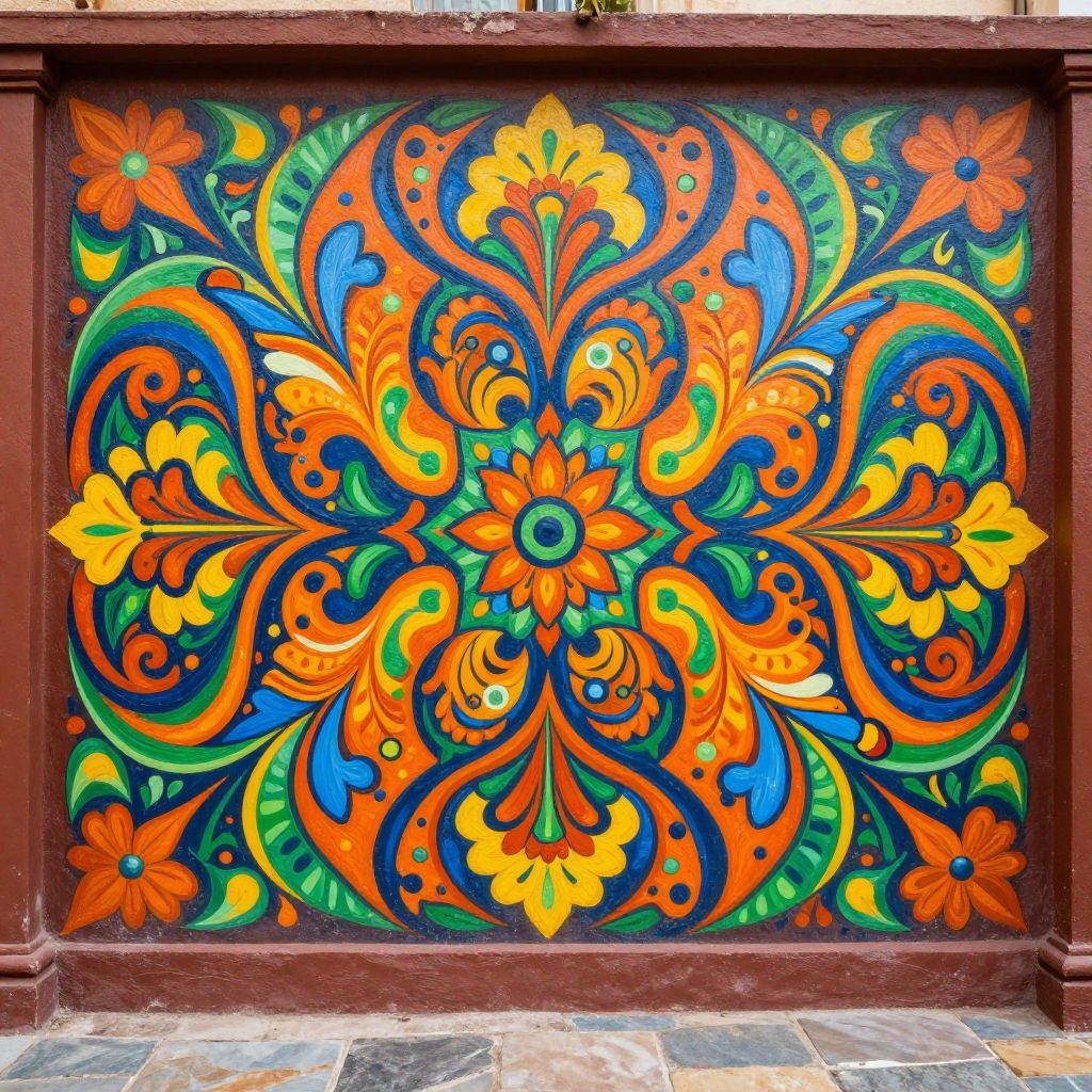 Vibrant and intricate tribal mural featuring symmetrical patterns with stylized birds, vivid floral designs, and swirling organic shapes in bright orange, blue, green, and yellow tones. The artwork is painted on a wall with stone pavement at the base, blending nature-inspired elements and abstract decorations, creating a rich cultural aesthetic.