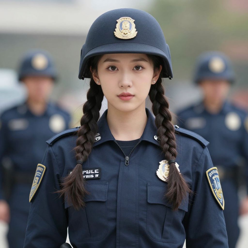 Photograph of a young Asian woman with long black braids, wearing a blue police uniform and helmet, with two blurred officers in the background.