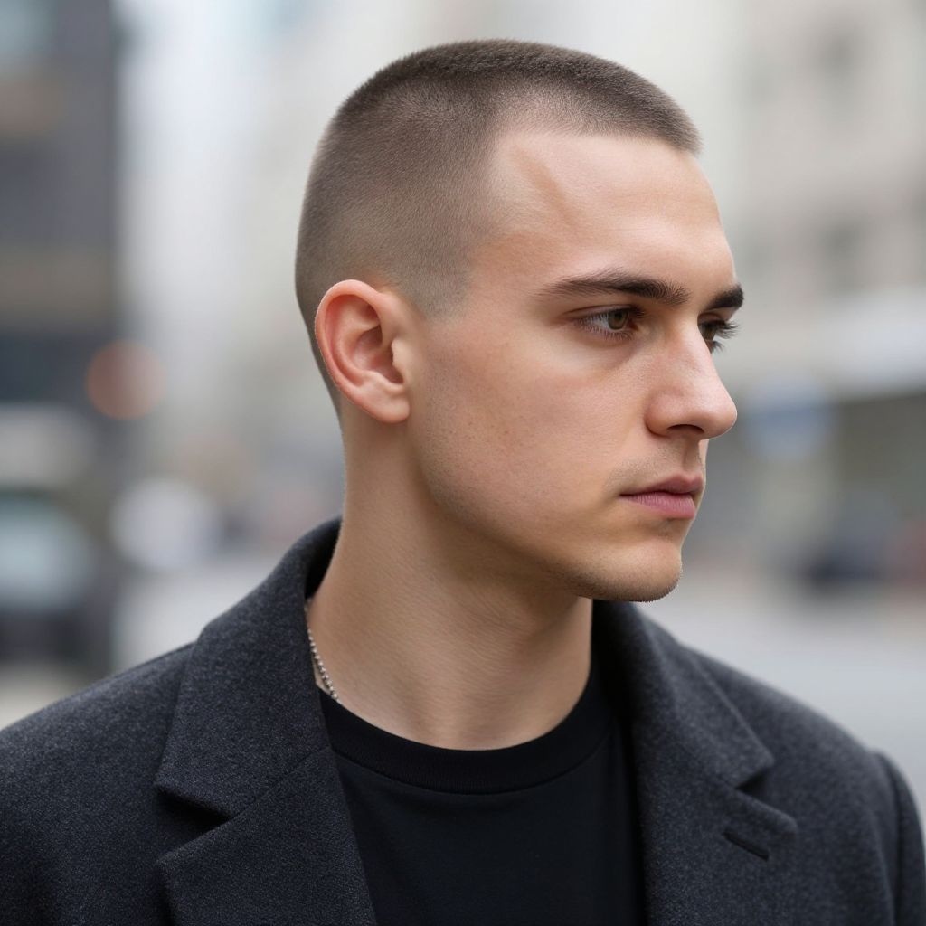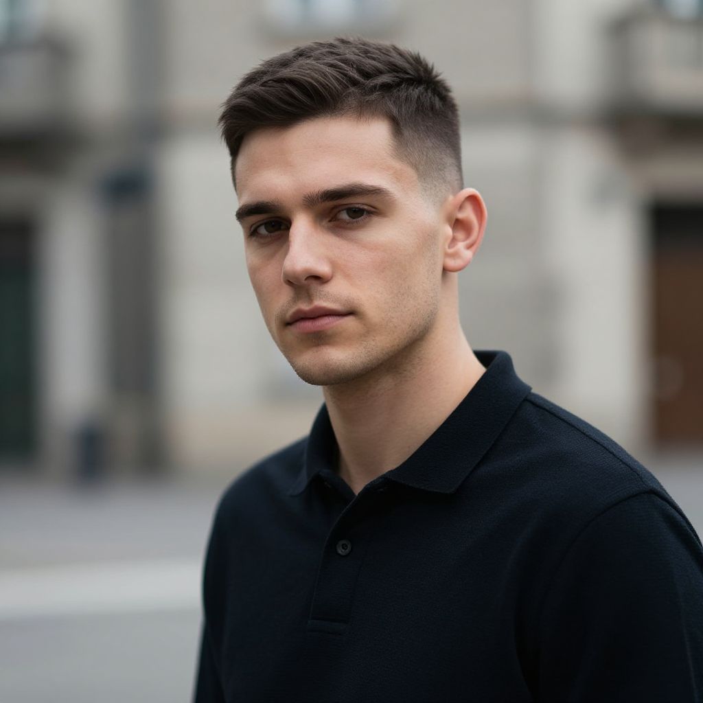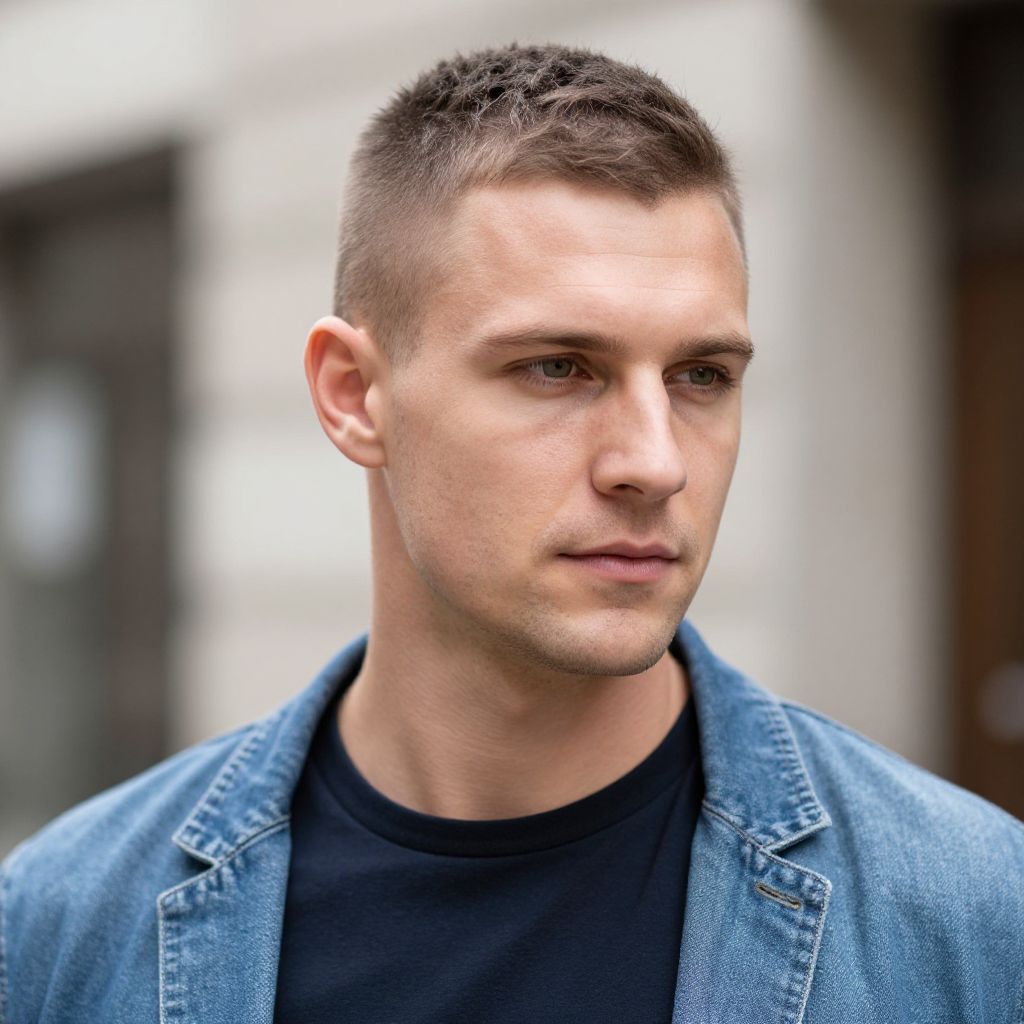 Buzz Cut Mullet, fit European man, in a trendy city setting, wearing smart casual clothes, realistic photography, detailed features, natural light, urban atmosphere