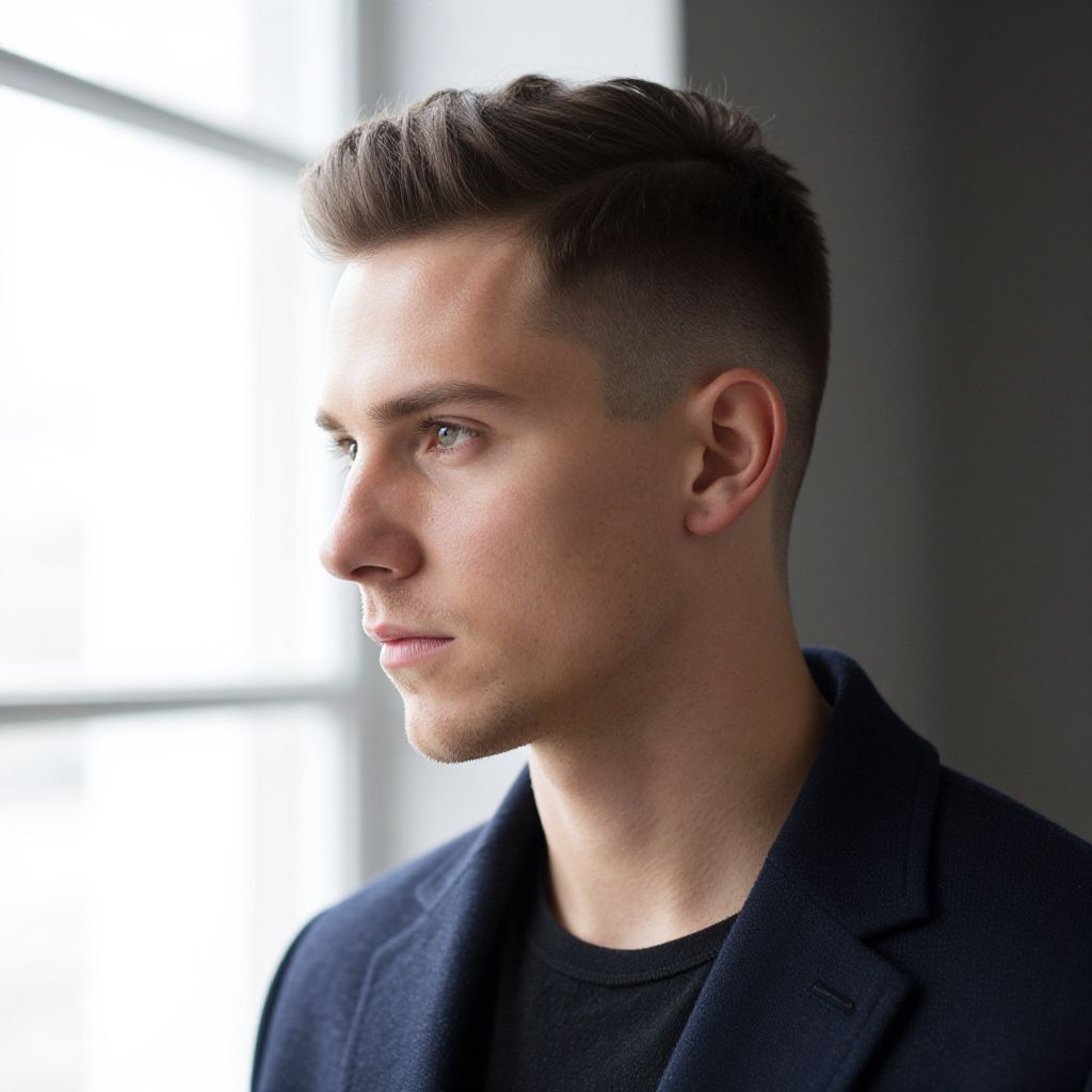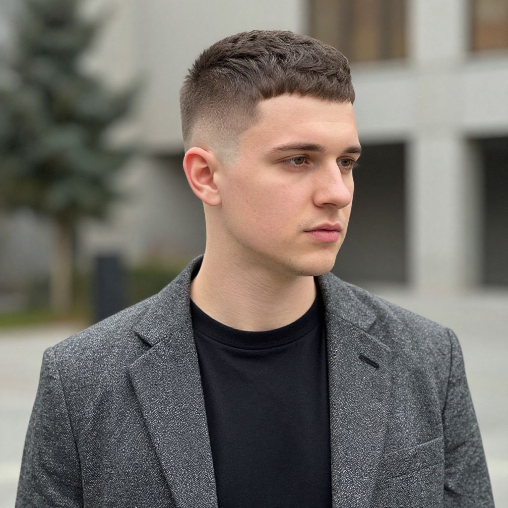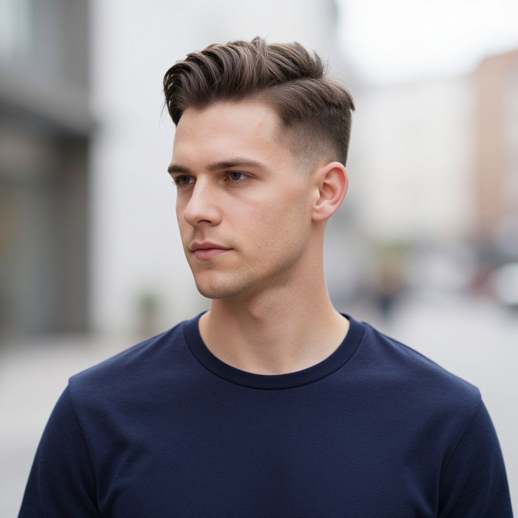 Buzz Cut Mullet, fit European man, in a trendy city setting, wearing smart casual clothes, realistic photography, detailed features, natural light, urban atmosphere