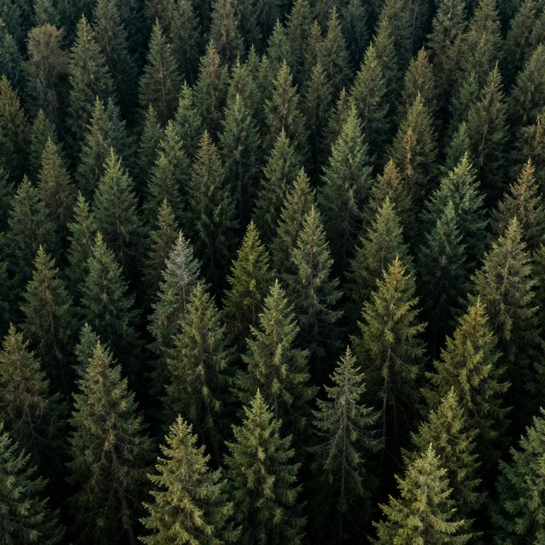 Aerial photograph of a dense, lush evergreen forest with tall, green pine trees, showcasing varying shades of green and a textured canopy from a top
