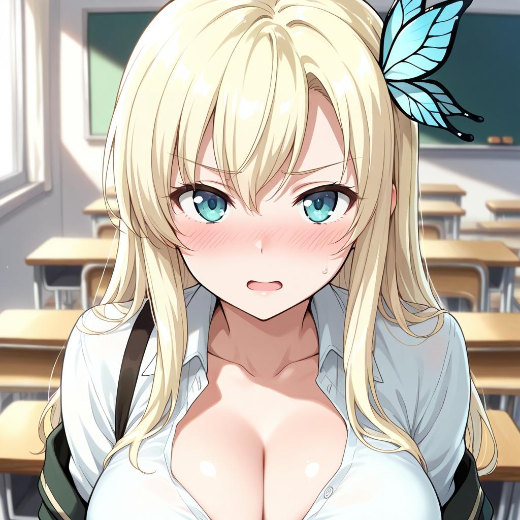 (best quality:1.1), (masterpiece:1.4), (absurdres:1.0), portrait, 1girl, kashiwazaki sena, butterfly_hair_ornament, blonde_hair, long hair, school uniform, large breasts, looking at viewer, classroom, open_mouth, (blush:1.2), happy