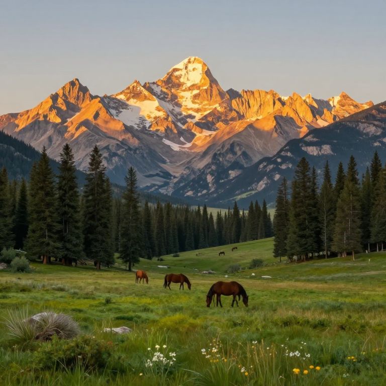 Photograph of a vibrant mountain landscape at sunset. A group of brown horses grazes in a lush, green meadow dotted with wildflowers and tall grasses in the foreground. Pine trees line the midground, leading the eye to towering, sunlit mountains in the background with rugged peaks and snow patches. The mountains are bathed in warm, golden light, contrasting with the deep blue sky above. The overall scene is serene and picturesque, capturing the beauty of nature.