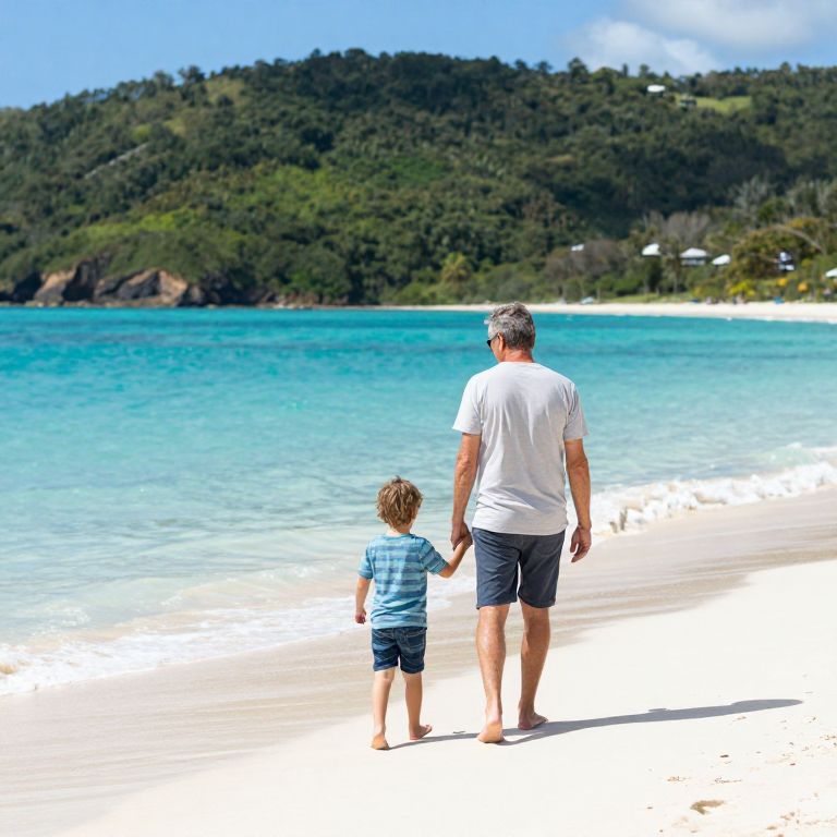 Father and son enjoying a sunny day on the pristine beaches of the Whitsundays in Australia, with turquoise waters and lush green hills in the background.