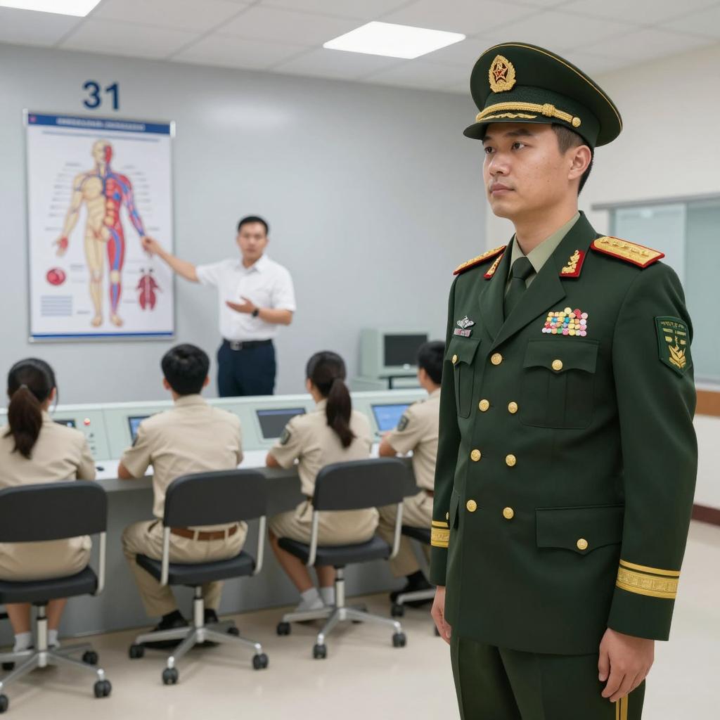 Seven Asian soldiers wearing metallic helmets and beige military uniforms sit in a row on a concrete surface, attentively listening to an officer in a green uniform and cap standing in front of them. The setting is an outdoor area beside a gray building with multiple windows. The soldiers wear black boots and carry tactical gear, while the officer's hands are clasped behind his back.