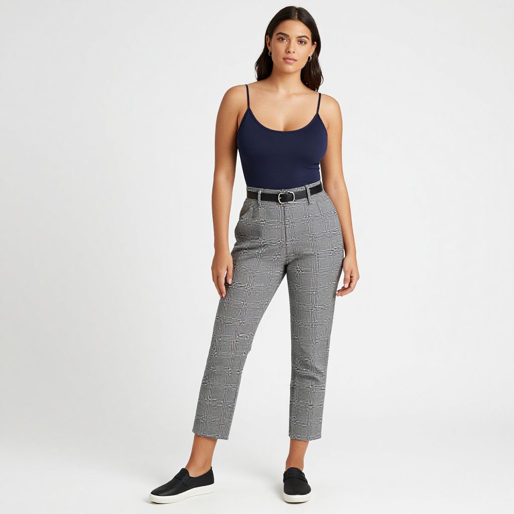 "Woman, casual streetwear, cropped tank top with black and white plaid pattern, square neckline, sleeveless, light-wash high-waisted mom jeans, black chunky platform sandals, white background.. Sexy. Pretty face and beаutiful eyes. Big breasts."