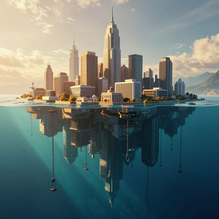 Suspended between sky and sea, a mirrored metropolis defies gravity, inviting contemplation of the delicate balance between human ambition and nature’s serenity, while the soft whispers of wind and the gentle flapping of wings evoke a sense of timeless wonder and freedom.