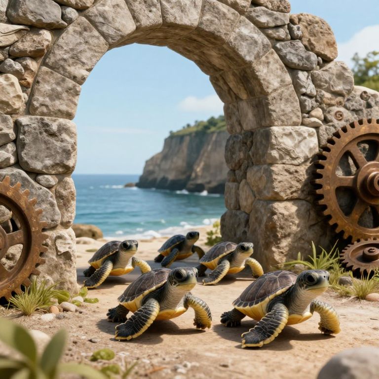 A surreal procession of newborn turtles, each with curious eyes and tiny shells, marches determinedly toward an enormous stone archway, as if tasked with turning the world's unseen gears at the edge of a tranquil seaside cliff.