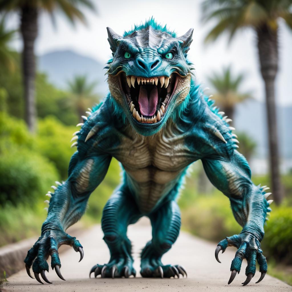 A realistic and detailed blue monster with sharp teeth, green eyes, and claws. The creature has a fierce expression with its mouth wide open, showing its tongue and numerous sharp teeth. The monster has horns, spikes along its back, and a muscular build. The background is a blurry outdoor forest setting with greenery and mountains.