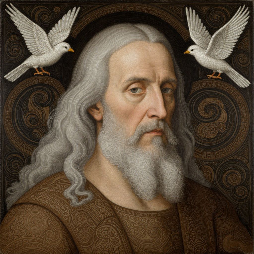 This digital artwork features a detailed portrait of an elderly man with long, wavy, silver hair and a full, white beard. He has a solemn expression and is wearing a brown, intricately patterned robe. Two white doves with outstretched wings are positioned symmetrically on either side of his head, creating a halo effect. The background is dark with ornate, circular patterns. The man's pale skin and the realistic texture of his hair and beard contrast with the smooth, detailed feathers of the doves. The style is reminiscent of classical religious art.