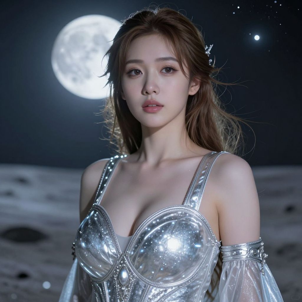 Photograph of an East Asian woman with fair skin and long, light brown hair standing on a moonlit, rocky landscape. She wears a shimmering, silver, off-shoulder dress with a deep V-neck and large, circular, reflective breast cups. Her expression is calm and slightly mysterious. The bright full moon in the dark night sky serves as a backdrop, with small stars visible around it. The texture of her dress is metallic and reflective, catching the moonlight. The image has a surreal, almost fantasy-like quality.