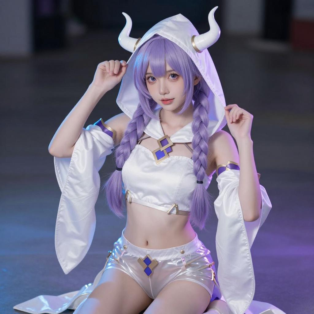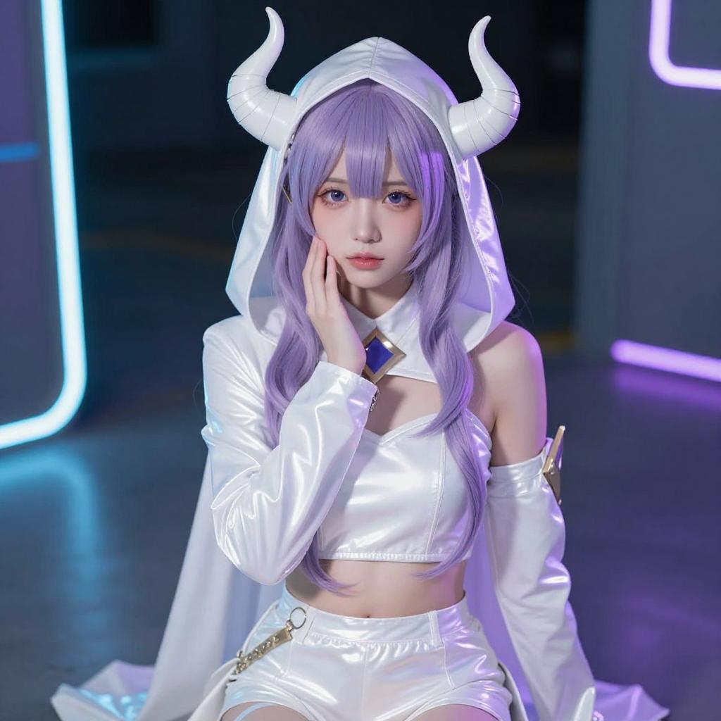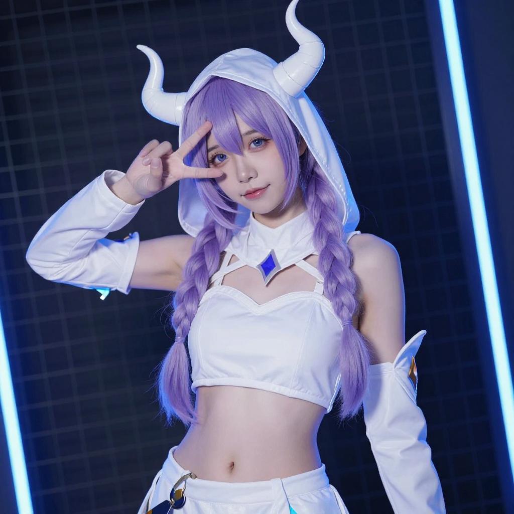 Photograph of a young woman with light purple hair in twin braids, wearing a white, hooded, fantasy costume with horn-like headpieces. She has large, expressive blue eyes, fair skin, and is posing with her right hand touching her head. She wears a shiny, white, cropped top with puffed sleeves and white shorts. A blue neon light glows beneath her, and the background is dark.