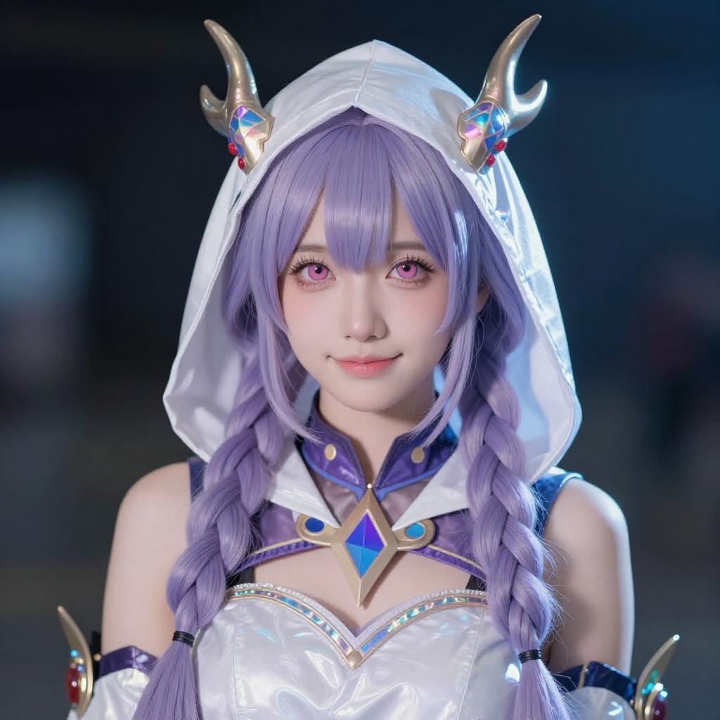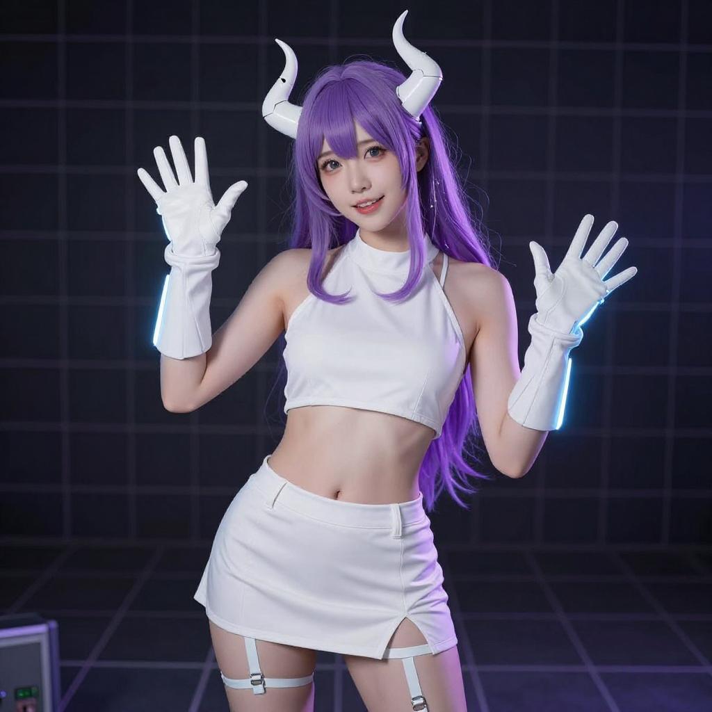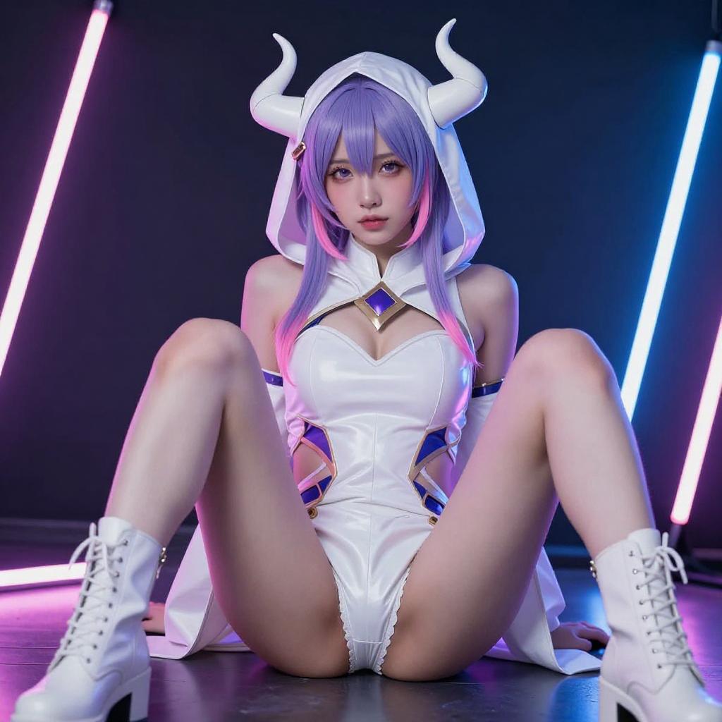 Photograph of a young woman with light purple hair in twin braids, wearing a white, hooded, fantasy costume with horn-like headpieces. She has large, expressive blue eyes, fair skin, and is posing with her right hand touching her head. She wears a shiny, white, cropped top with puffed sleeves and white shorts. A blue neon light glows beneath her, and the background is dark.