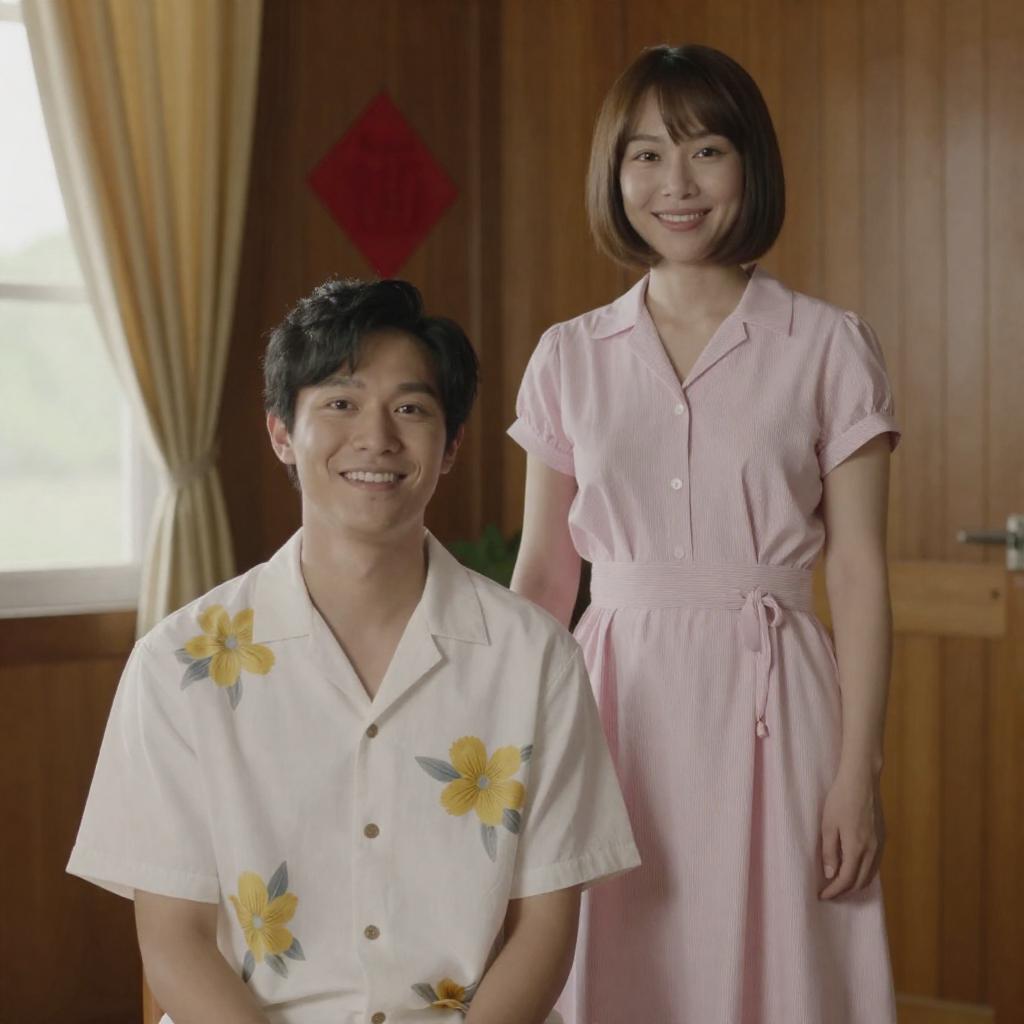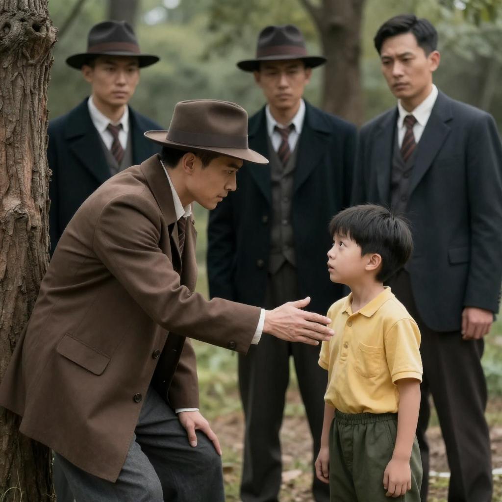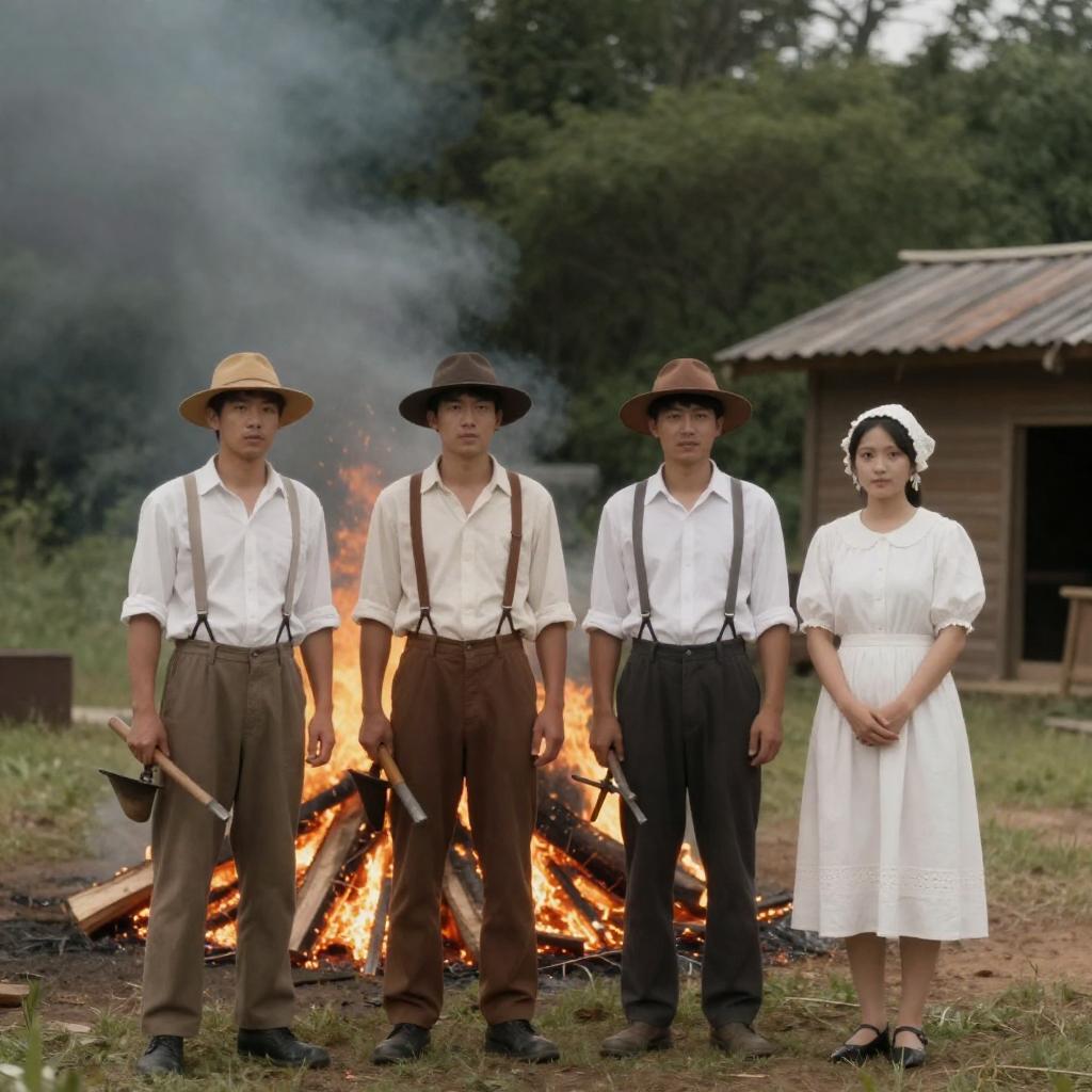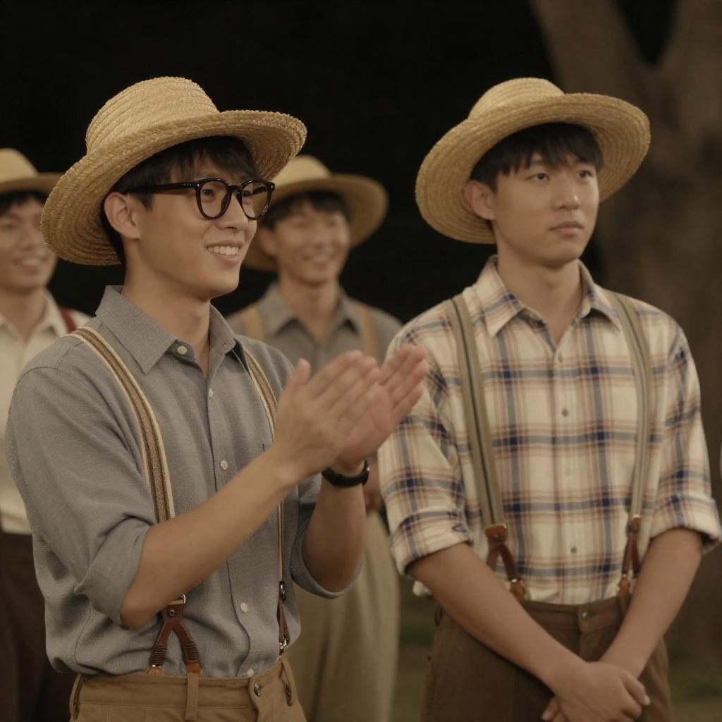 Photograph of two young men in a vintage setting. Both wear straw hats and plaid shirts with suspenders. The man on the left, with glasses and a smile, claps his hands. The man on the right, with a neutral expression, stands with hands in front. Two other people, one smiling, are in the background. Warm, dim lighting with a tree on the right.