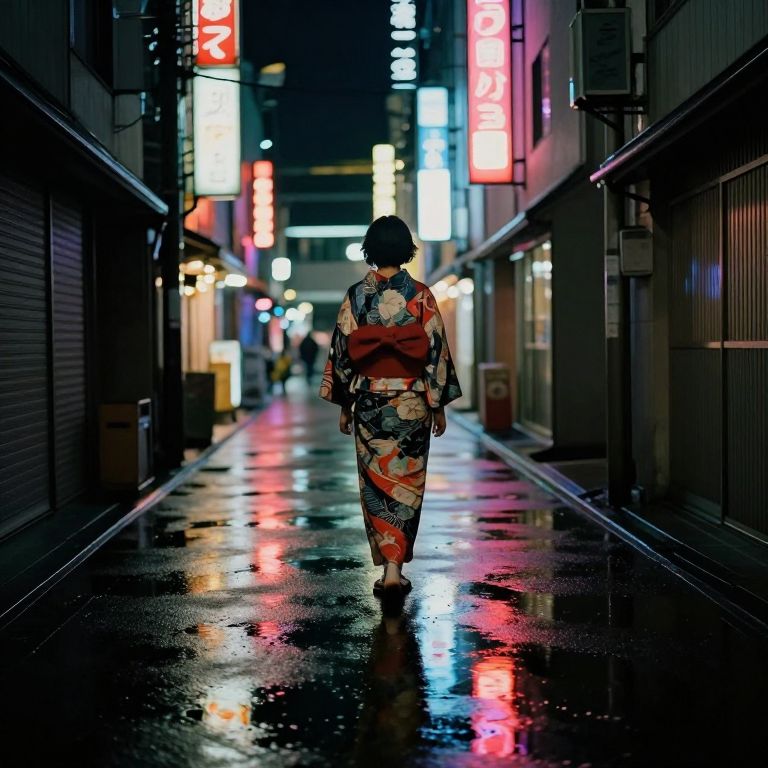 Kar-wai cinematic visual of a rainy city alley at dusk, neon reflections on wet pavement, solitary character with umbrella walking away, layered composition with depth, warm and cool tones blending, evocative of timeless love and solitude