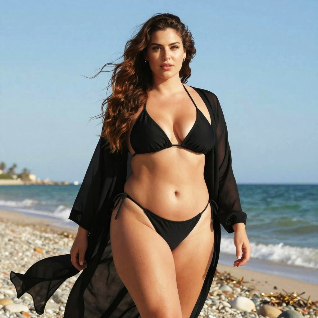 A Plus-size woman in a casual black sheer long-sleeved tunic with a cowl neck and solid black undergarment, mid-thigh length, stands in a luxury spa retreat on a private island in Fiji, captured in the visual style of Richard Estes. Sexy. Pretty face and beаutiful eyes. Big breasts