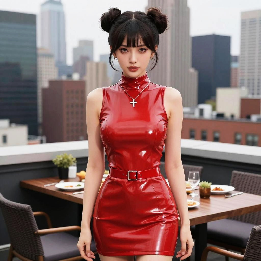 A woman, in a glossy red mini dress with a high neck and matching shiny waistband, styled in toei animation, stands at a rooftop dining in New York City, her hair in dual topknots and a subtle cross pendant necklace adorning her neck. Sexy. Pretty face and beutiful eyes