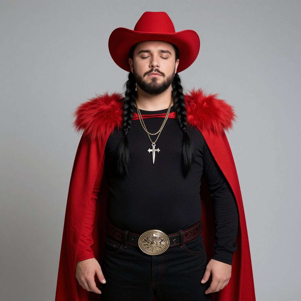 Photograph of a bearded man with closed eyes and a serious expression, wearing a bright red cowboy hat, a black long-sleeve shirt, and a red cape with fur-lined shoulders. He has long black braids and a silver cross necklace. His black pants are belted with a large, ornate, silver buckle. The background is a plain, light grey, creating a stark contrast to his vibrant red cape. The overall style is a mix of Western and medieval influences.
