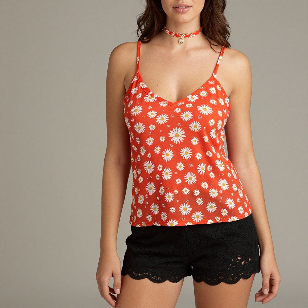 "Woman, casual summer style, floral print camisole in orange-red with white daisies, V-neck, relaxed fit, black lace-trimmed shorts, scalloped hem, choker necklace with small pendant, photo studio background.. Sexy. Pretty face and beаutiful eyes. Big breasts."