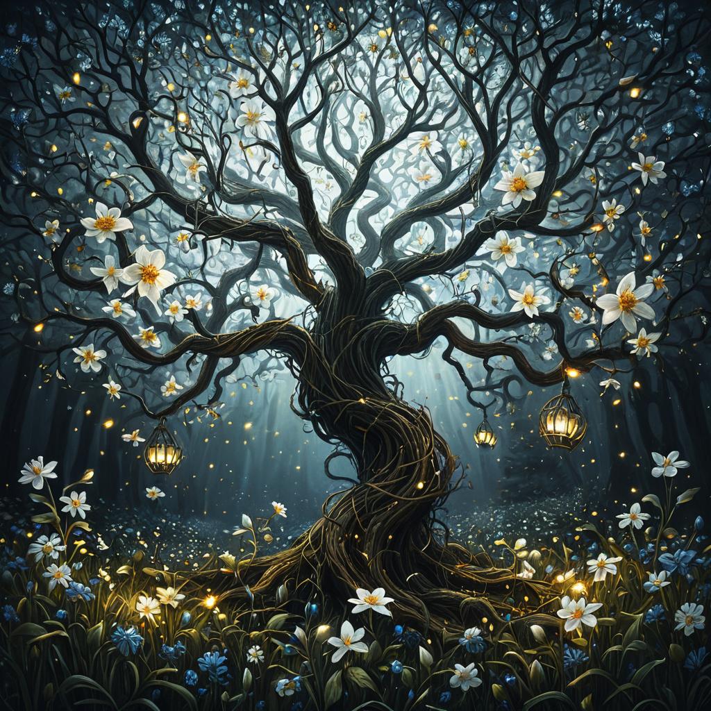 A highly detailed digital painting of a mystical tree with twisting dark branches adorned with glowing lanterns and white flowers. The tree stands in a magical forest with dynamic lighting and intricate foliage, featuring a luminous and ethereal atmosphere inspired by fantasy art styles.