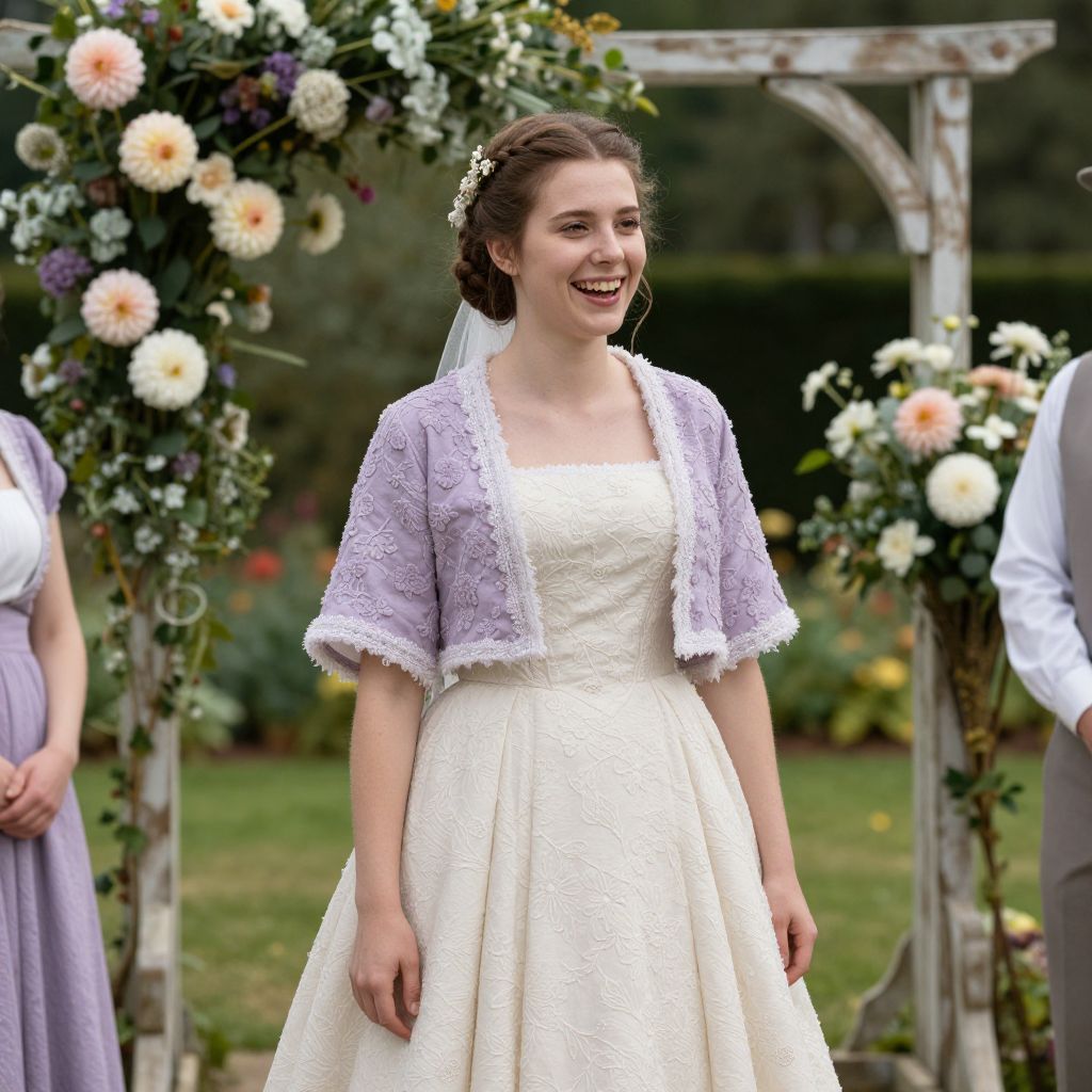 Photograph of a smiling Caucasian woman with fair skin and brown hair in an updo, wearing a white lace wedding dress and a light purple lace shawl. She stands outdoors in front of a wooden wedding arch adorned with white, pink, and purple flowers. To her left, a partially visible woman in a lavender dress is standing, and to her right, a man in a white shirt is partially visible. The background features a lush green garden. The woman's dress has a textured lace pattern, and she wears a small flower in her hair. The overall scene is bright and cheerful.