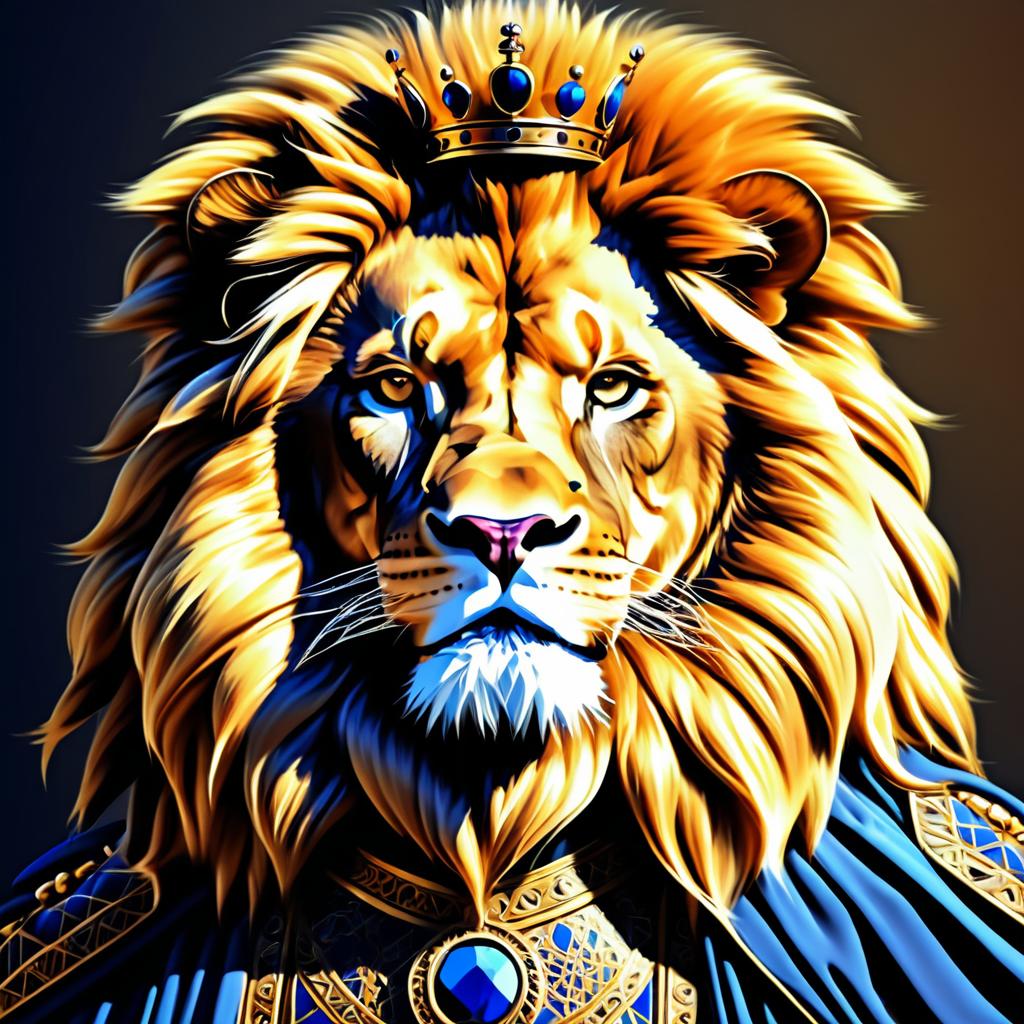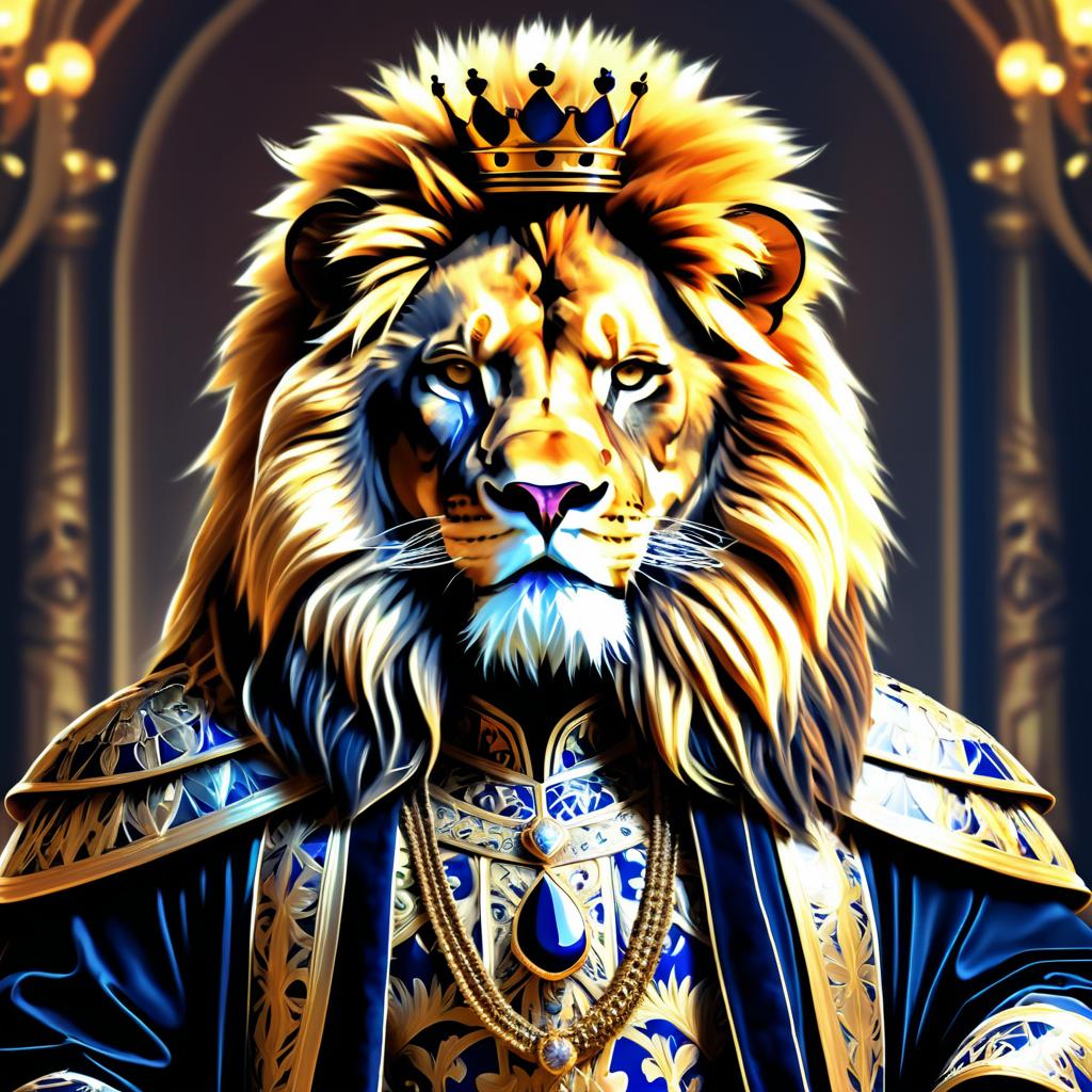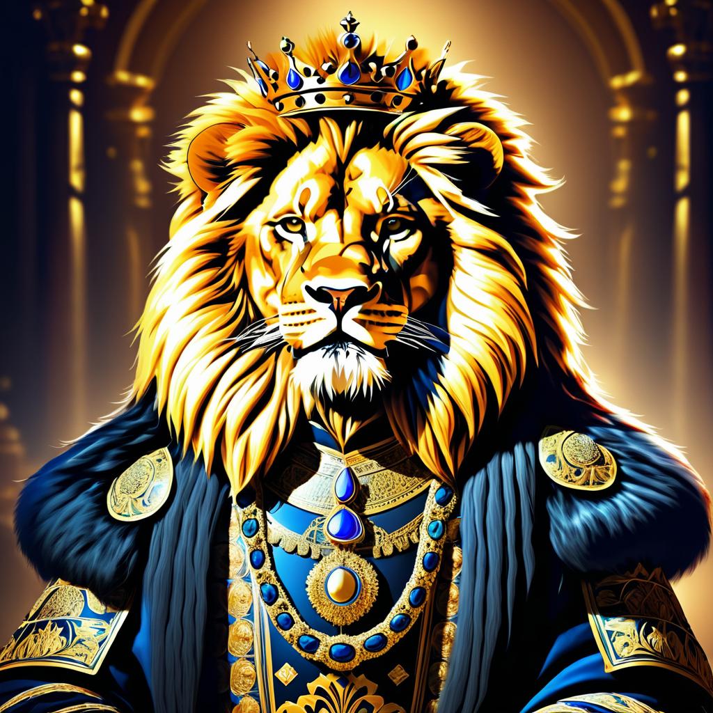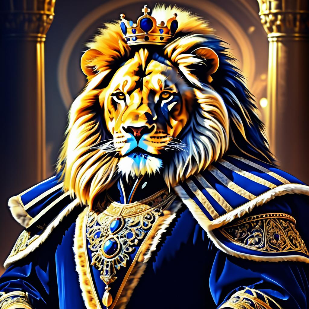 Digital illustration of a majestic lion wearing a golden crown and ornate royal robe with blue feathers, set against a background of grand architectural columns. The artwork highlights the lion's detailed mane and intense gaze, symbolizing power and nobility.