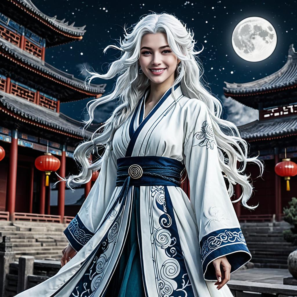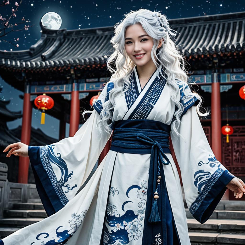 A female model with long white wavy hair wearing a detailed blue and white spellcaster robe, standing outdoors under a bright full moon and starry night sky. The setting features traditional ancient Chinese architecture illuminated with warm lantern light. The mage has a smiling expression and is posed gracefully with flowing robes, embodying a fantasy anime style with detailed facial features and eyes.
