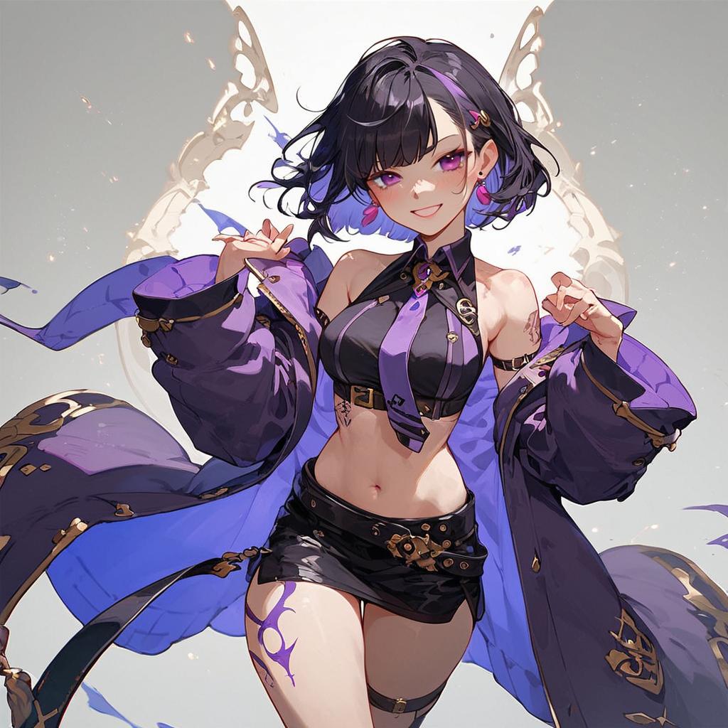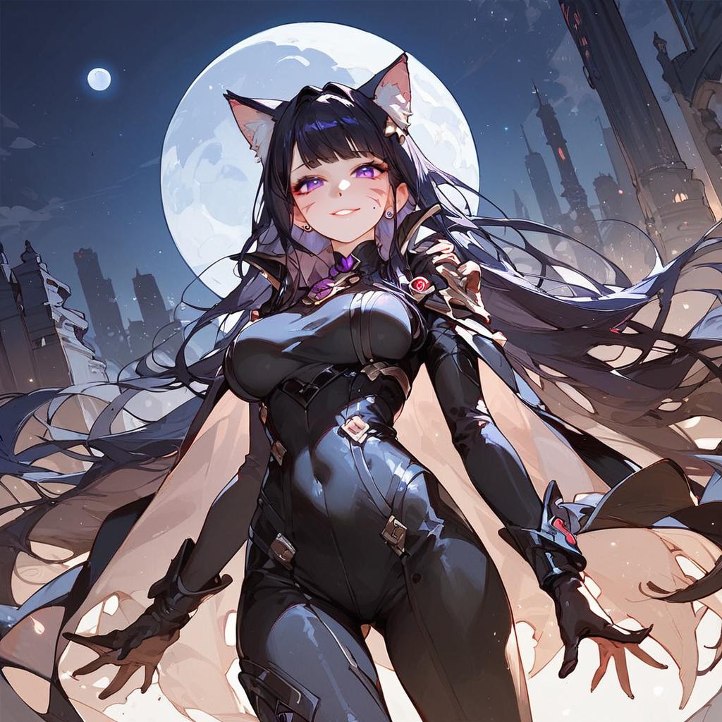 Score_9, score_8_up, score_7_up, score_6_up, score_5_up, score_4_up, masterpiece, best quality, solo, black hair, animal ears, moon, gloves, mask, short hair, looking at viewer, bangs, o-ring, black theme, purple eyes, black gloves, mouth mask, navel, full moon, blunt bangs, bob cut, rabbit ears, upper body, flat chest, belt, long sleeves, black background, night