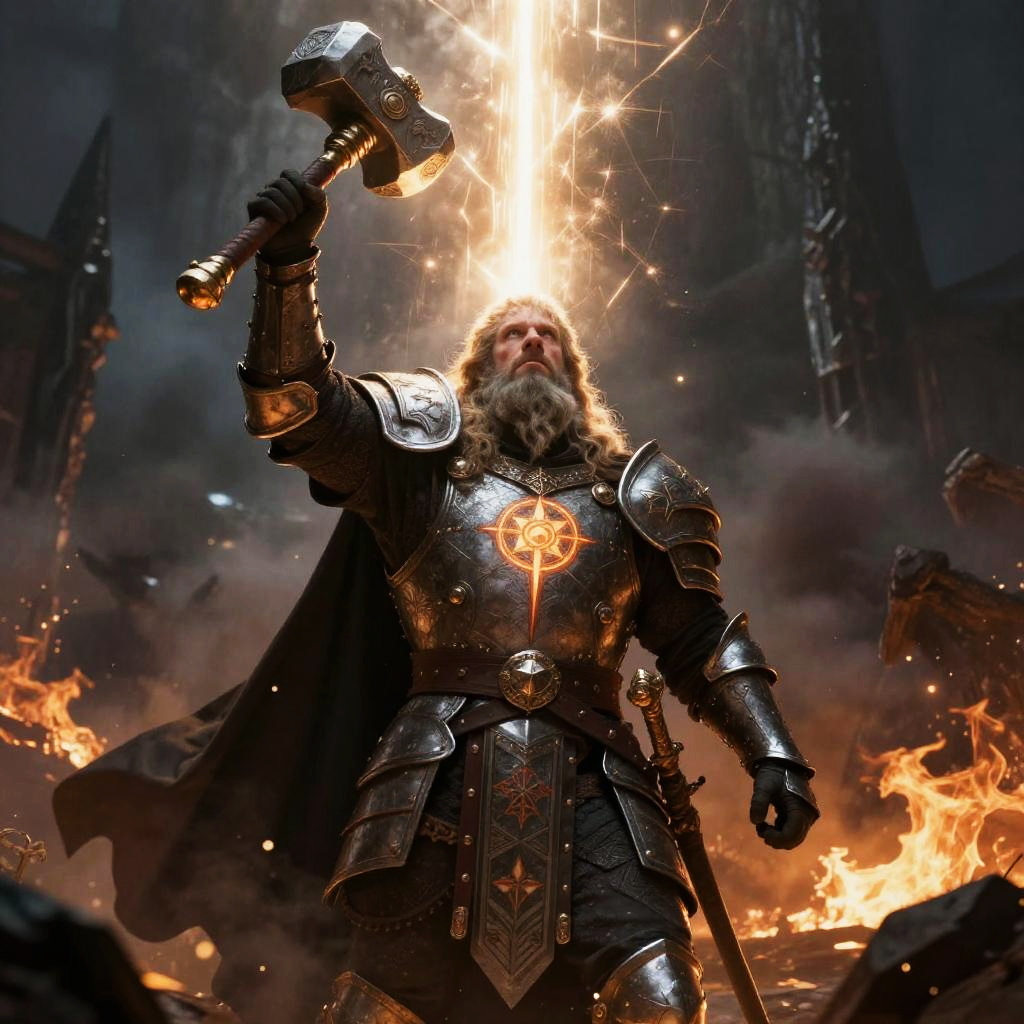 Dwarf paladin art showing a stoic dwarf knight in ornate armor adorned with holy symbols, raising a hammer towards the sky as divine light cascades down, amidst a dark battlefield with fire and smoke, epic fantasy style with intricate details and strong heroic presence.