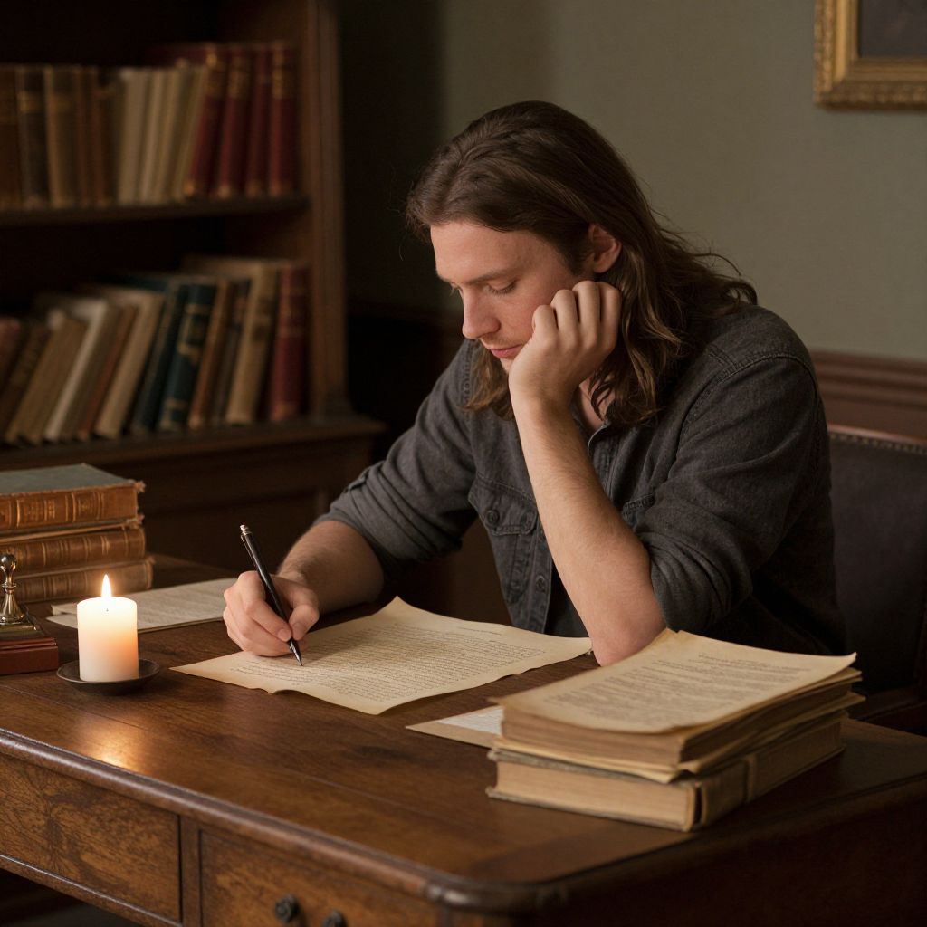 Long brown hair man sitting at an old wooden desk in a cozy study filled with ancient books and parchment, soft ambient light from a nearby candle, thoughtful expression as he writes, warm tones and intricate details creating a calm intellectual ambiance.