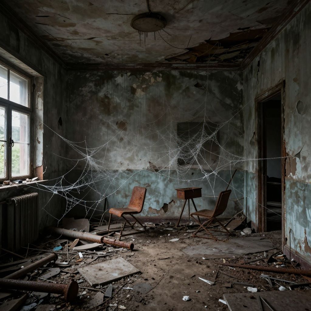 Photograph of a dilapidated, abandoned room with peeling, dark blue-gray walls and a dirty, cracked ceiling. A large, intricate spiderweb spans from the upper right corner to the center. Two broken wooden chairs sit near the back, amidst scattered debris, including wooden planks, papers, and a radiator on the left. A single, grimy window on the left side allows faint natural light, highlighting the room's decay. The floor is covered in dirt and debris. The overall atmosphere is eerie and neglected.