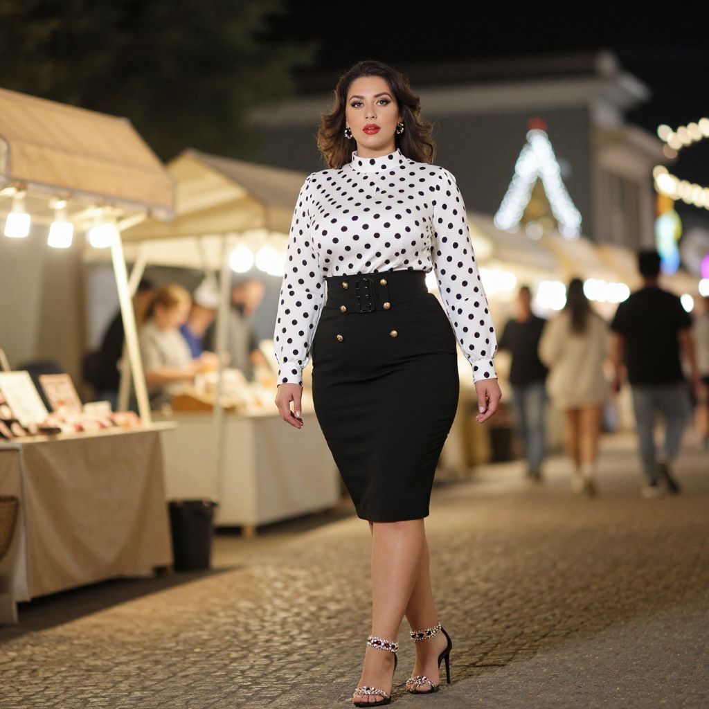 A Plus-size woman, business chic, white blouse with black polka dots, high neckline, long sleeves with buttoned cuffs, tucked into a black pencil skirt with gold button details and a belt, stiletto sandals with jewel embellishments, Wonderland night market with glowing stalls, tilt-shift effect, miniature look Sexy. Pretty face and beаutiful eyes. Big breasts